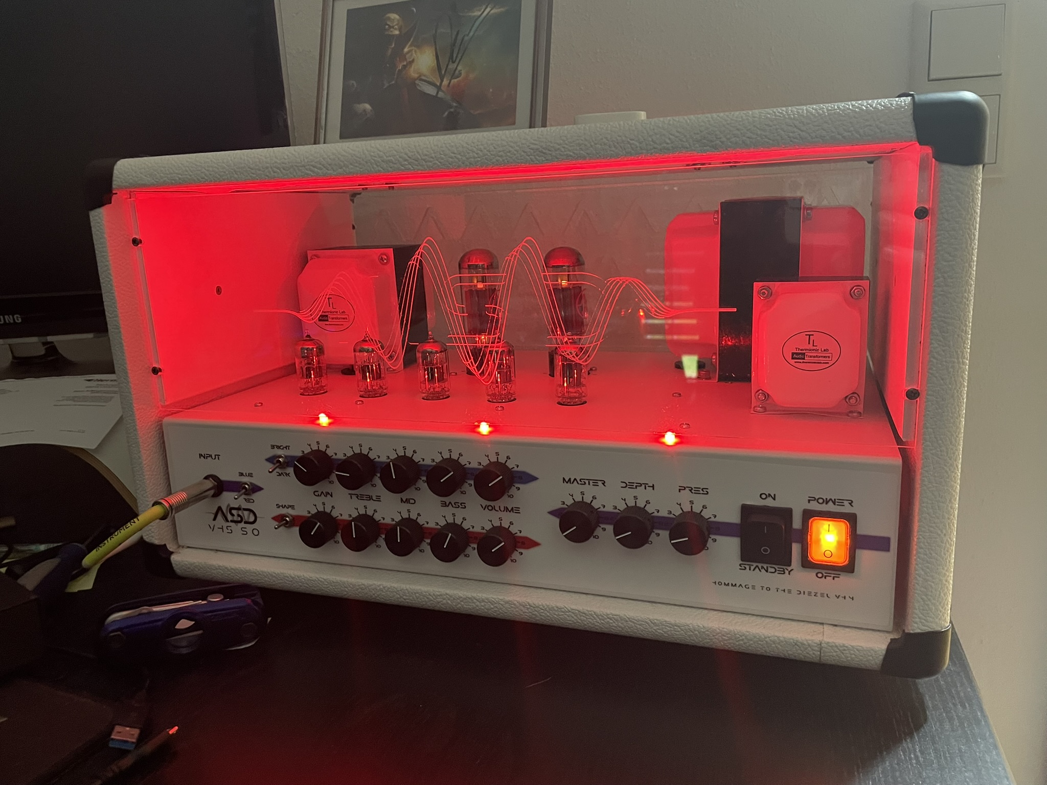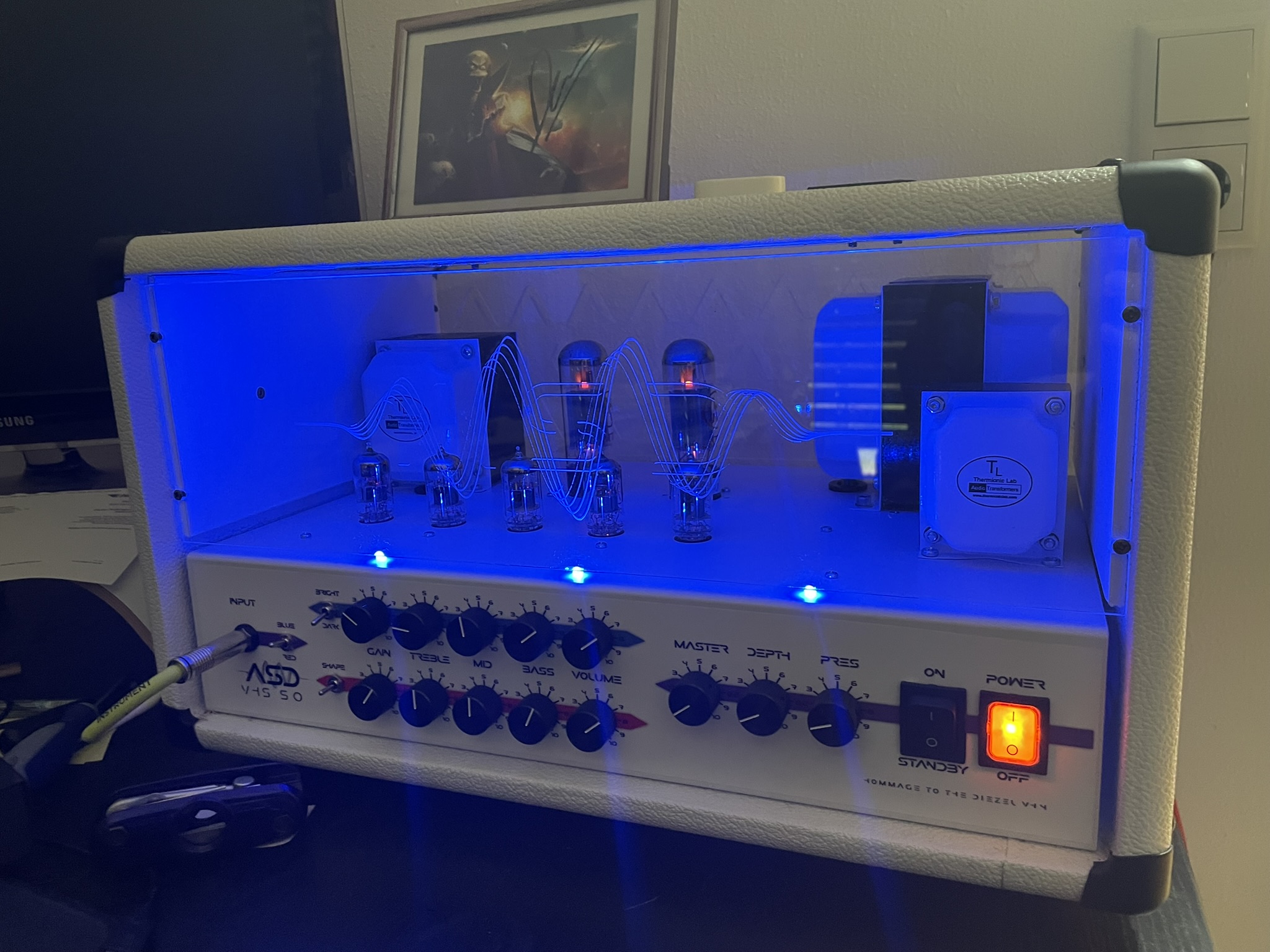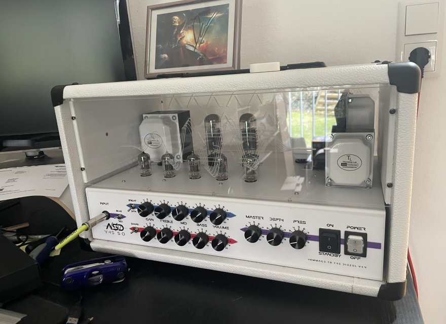 Attached are a few pictures of my 2 channel guitar amplifier based on a pair of push pull KT77 with 5 12ax7 in the preamp. I think it looks neat - the color changes depending on the active channel.